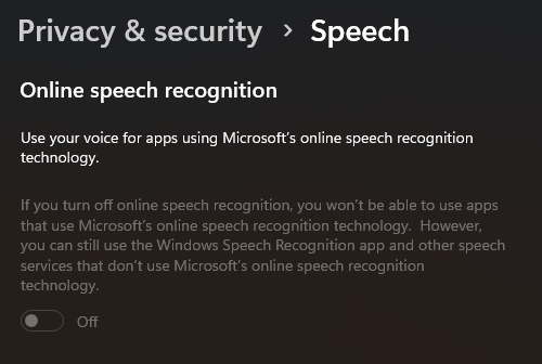 I have tried researching solutions, but they all seem to suggest activating the online speech recognition option, which is currently greyed out and inaccessible. (see screenshot below).