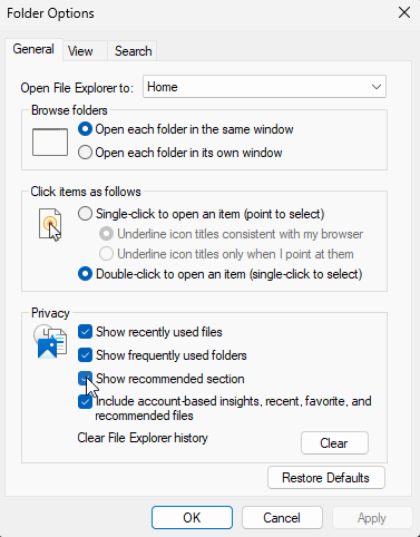 - Uncheck 'Show recommended section'