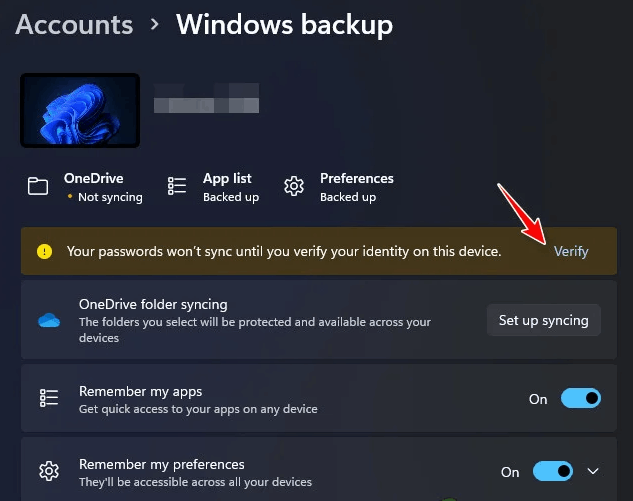 Note: If you don’t see the ‘Your password won’t sync until you verify your identity on this device’ message, your account is already verified.