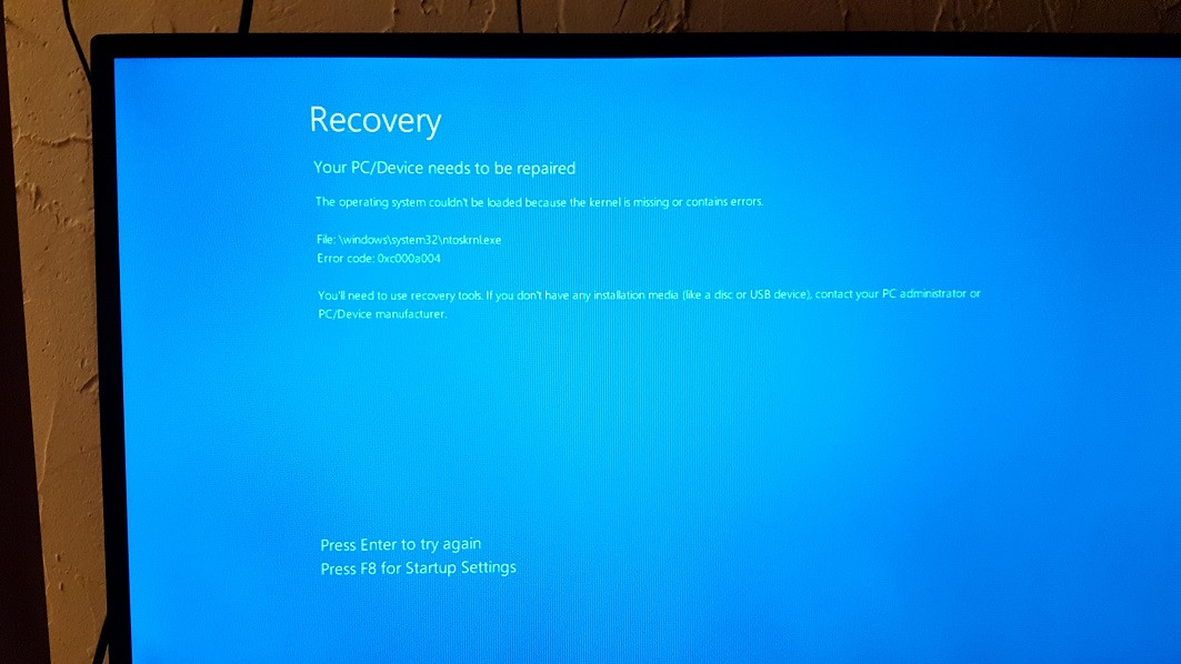The operating system couldn't be loaded because the kernel is missing or contains errors.File:\windows\system32\ntoskrnl.exeError code:0xc000a004