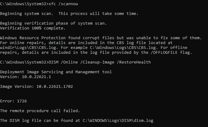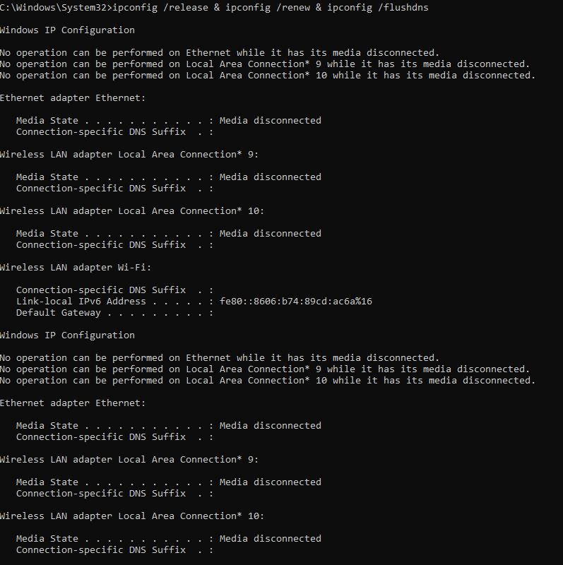 2023-08-04T02:17:14+00:00 I did the commands and SFC found corrupt files unable to fix them, DISM still failed, and the command "ipconfig /release & ipconfig /renew & ipconfig /flushdns" returned media disconnected for all Media states, and no there was no 3rd party antivirus. I had one installed before I did the In-place upgrade, but I uninstalled it then. (Edit: I should also probably note I have a window update which keeps failing "Update for Microsoft Defender Antivirus antimalware platform - KB4052623 (Version 4.18.23050.9)" Keeps failing with "Install Error: 0x80070643"