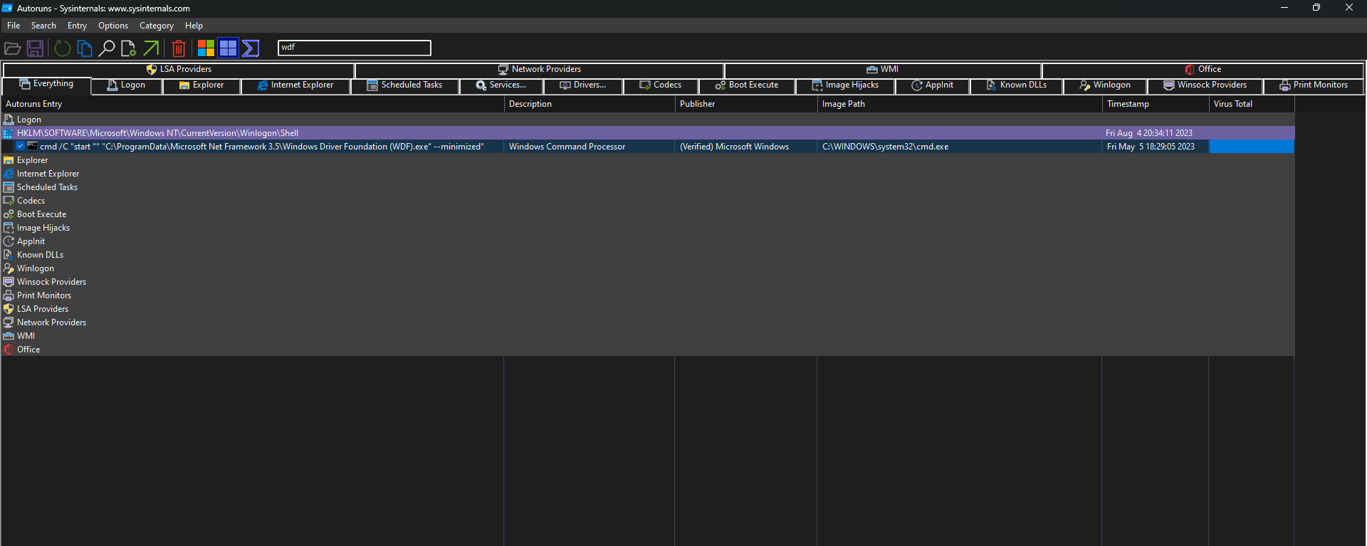 In the filter box in Autoruns, type WDF