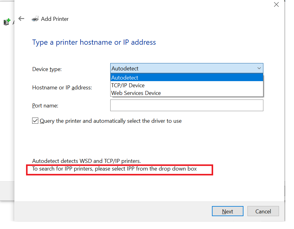 If the Internet Printing Protocol (IPP) option for Windows 10 Professional is not listed in the dropdown menu when you add a printer, it may be because your system does not have the components or Settings required for IPP printing enabled. To get the "IPP" option to add a printer, you need to enable the Internet Printing Client function:
