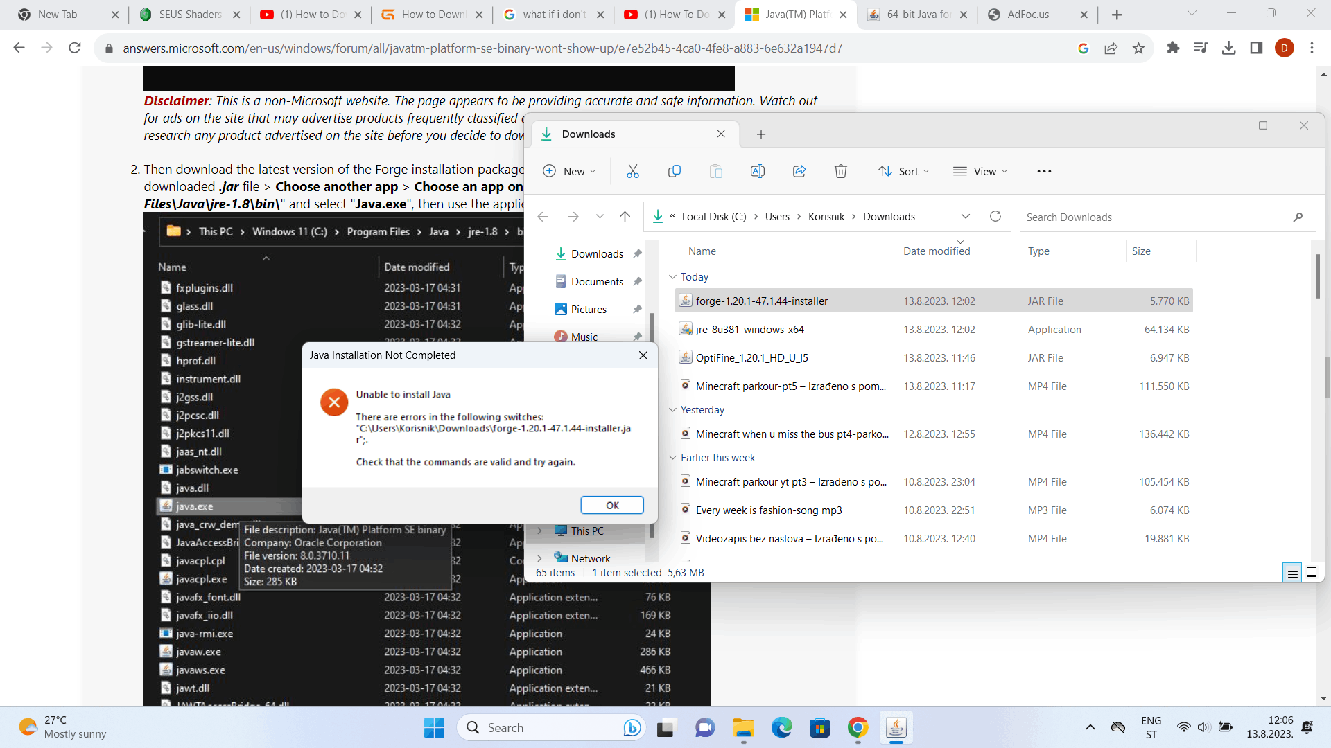 When I try to install forge-1.20.1-47.1.44-installer -openning with jre-8u381-windows-x64 it gives an error messege-I left the picture down bellow, could you help? Thanks.