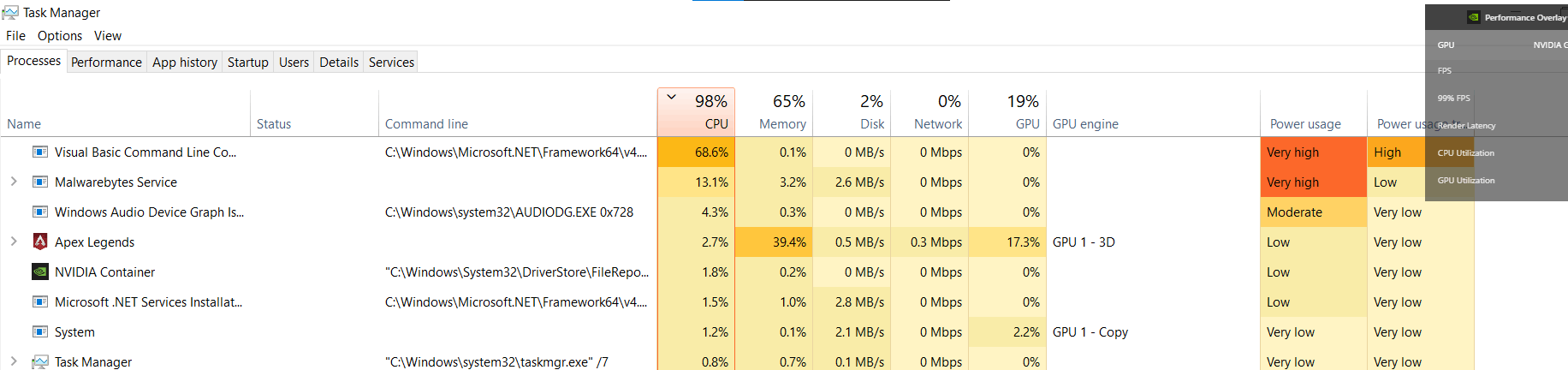 Leave that open and when the VB compiler is using huge resources, is there any indication in the Command Line column in Task Manager what is using that?