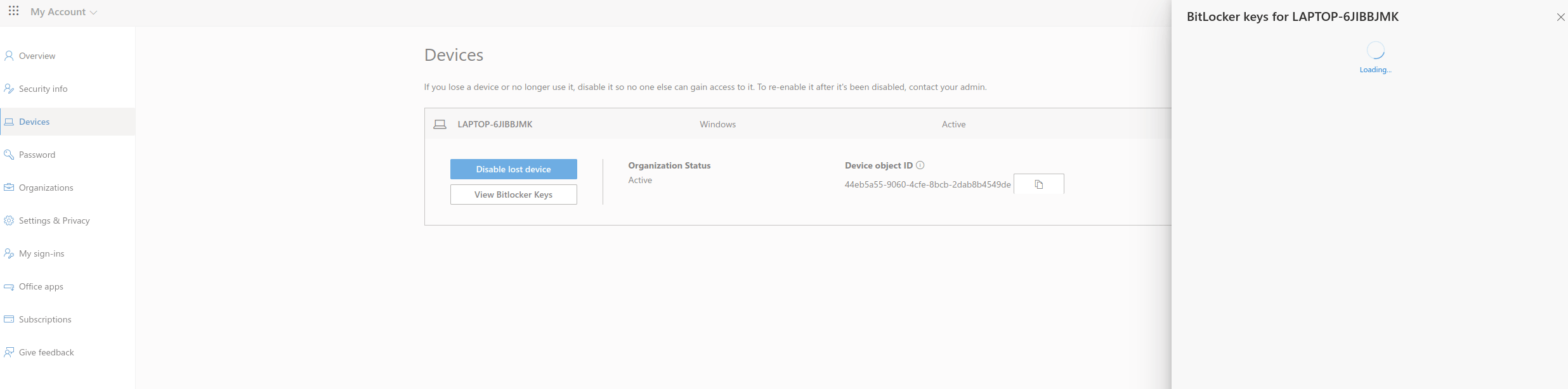 When I click on View Bitlocker Keys on my Microsoft account a Right side popup window opens with the name of my device but Loading forever?