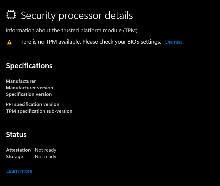 I’m sorry that you are experiencing this issue. Please check your BIOS settings”; your computer's TPM settings are likely disabled. To enable TPM, you can enter the motherboard’s BIOS and look for the option named Security, then locate TPM, Intel Platform Trust Technology (IPTT), or AMD CPU fTPM and enable TPM visibility.