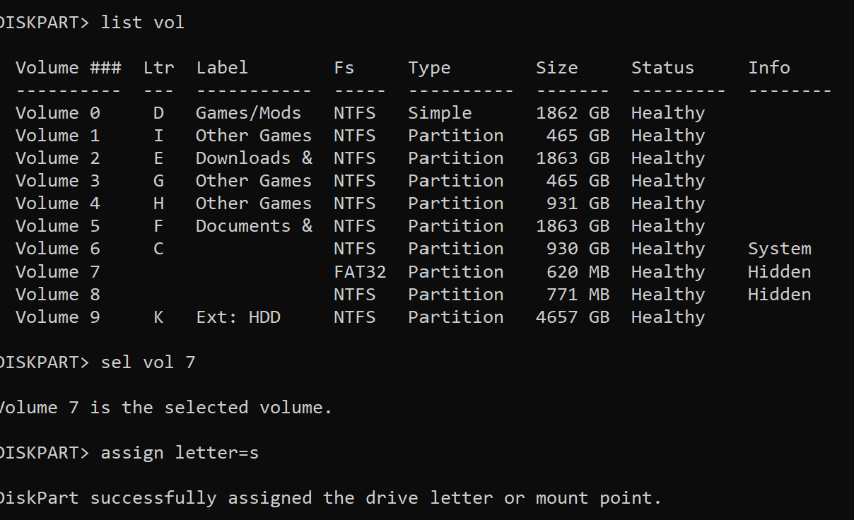 Assign  Letter=S     <<<Give it letter S -- unless List Vol shows it's already there