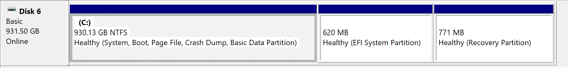 Looking at your prior listings, I now think the 8th partition down will be C. And EFI will be partition 9. Disks 0-5 will have 1 partition each, then Disk 6 shows...