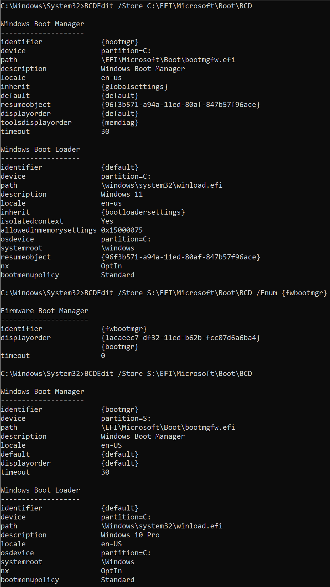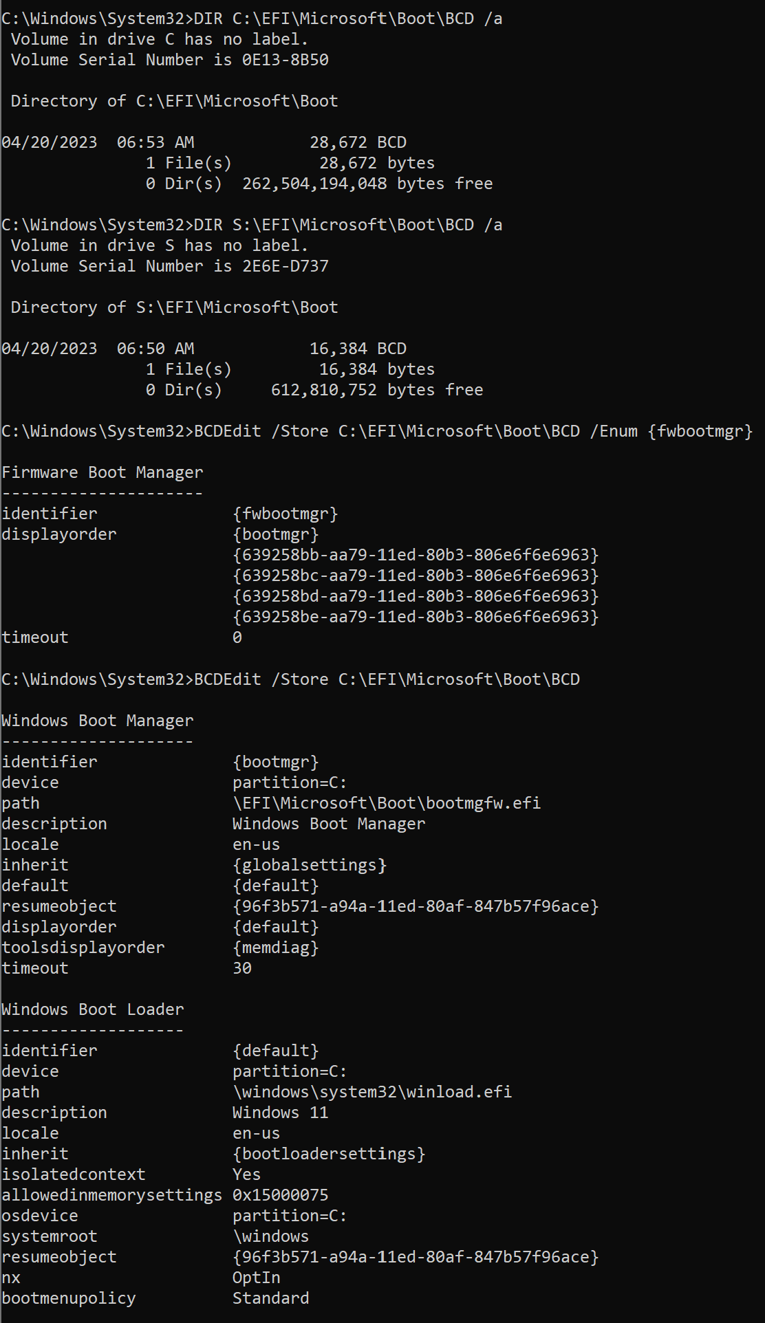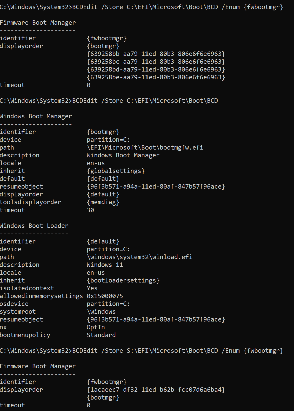 BCDBoot  C:\Windows  /s  S:  /f  UEFI <<< **** Rebuild the BCD in EFI & all other boot files.