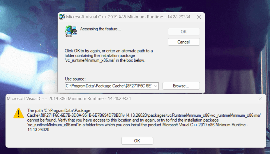 I am currently have a runtime error in which whenever I attempt to open a gaming software, I am meet with a Microsoft Visual C++ X86 Minimum Runtime -14.28.29334 error. It states that my pathway is not functional and when I attempt to click "OK" to find another path it tells me there is a problem with my Package Cache (8F271F6C-6E7B-3D0A-951B-6E7B694D78D)v 14.13.26020 on the vcRuntimeMinimum_x86\vc_runtimeMinimum_x86.msi. It turns out that this file is completely missing from my computer and after contacting support we discovered that I am unable to download anything from anywhere correlating to this file simply because it is gone. Any help would be greatly appreciated.