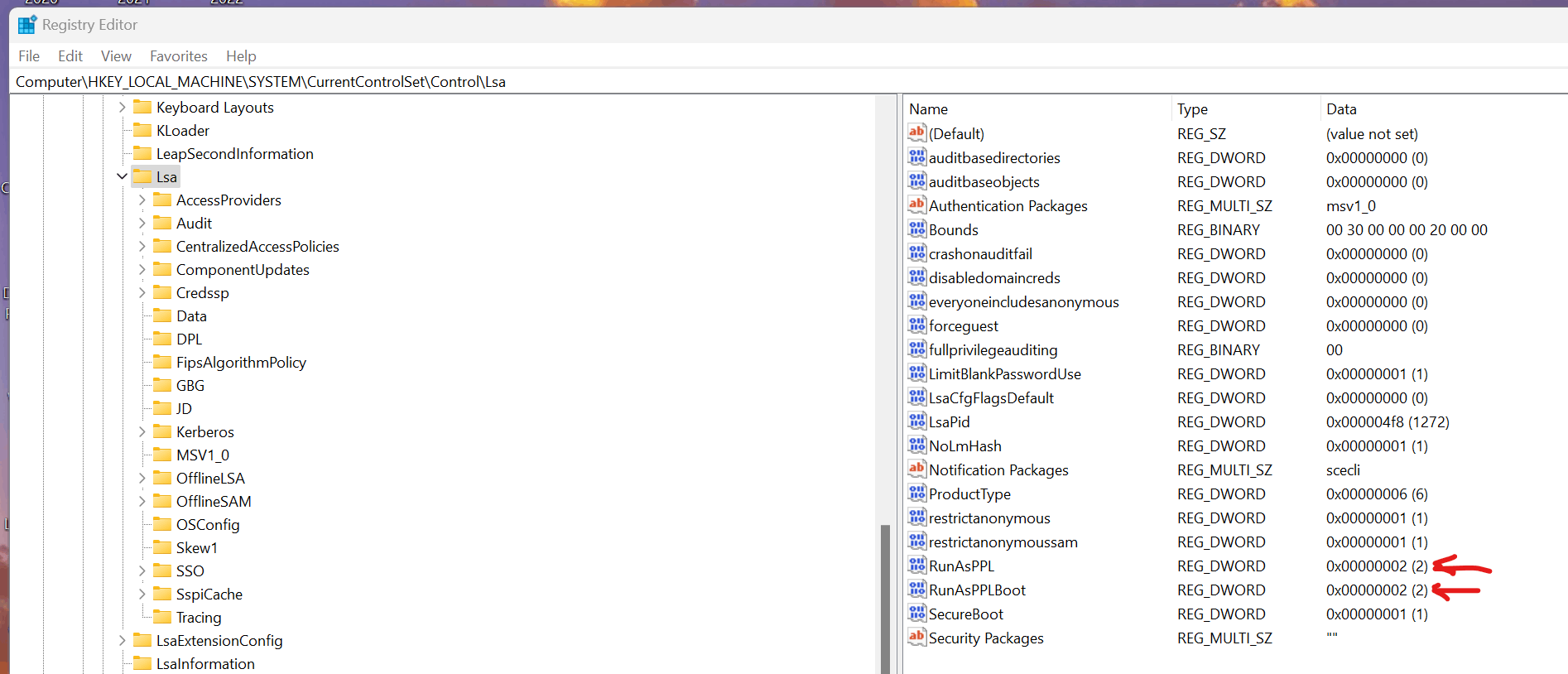 Windows Registry Editor Version 5.00 [HKEY_LOCAL_MACHINE\SYSTEM\CurrentControlSet\Control\Lsa] "RunAsPPL"=dword:00000002 "RunAsPPLBoot"=dword:00000002Edition Windows 11 Pro
