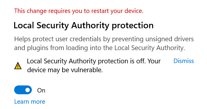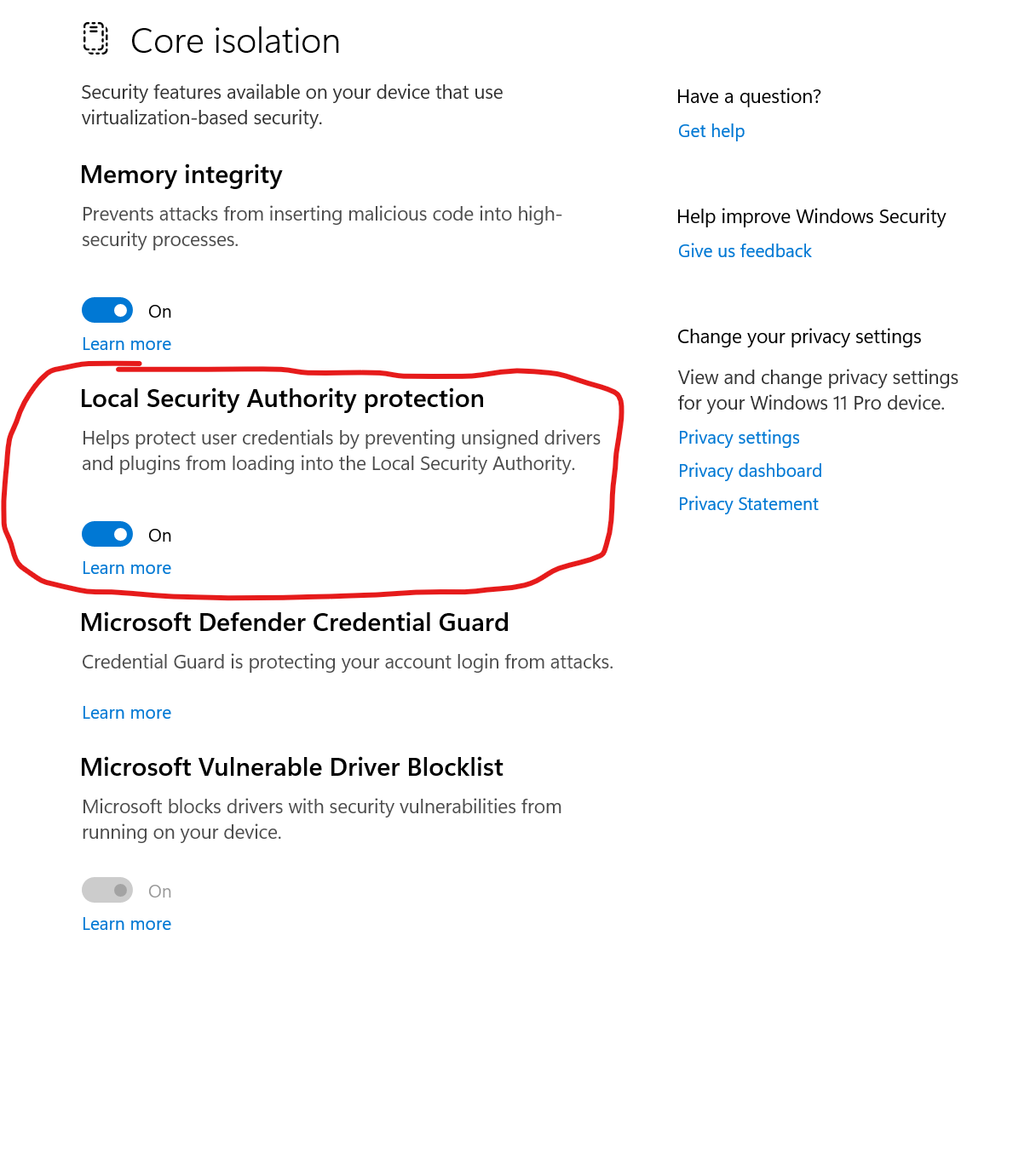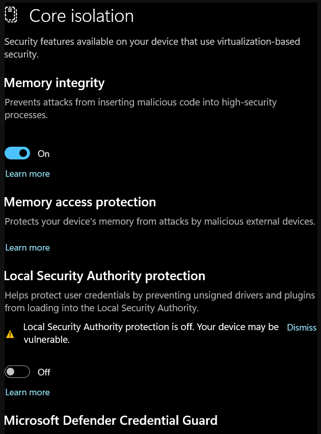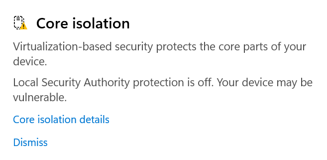 I can dismiss and disable LSA and just leave core Isolation that is already on.