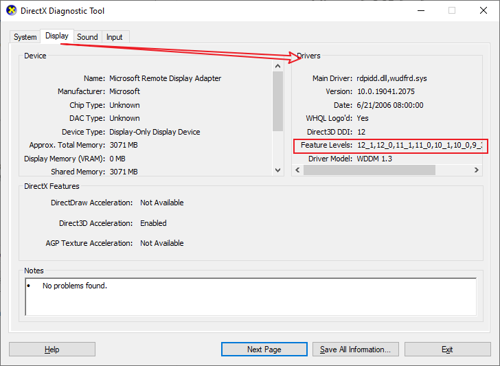 You can find DirectX Version in System tab. Feature Levels will be listed in Display tab, Drivers section.