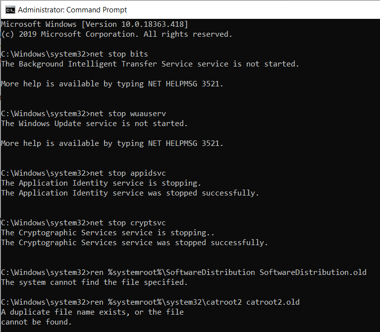 You will rename the SoftwareDistribution and catroot2 folder as SoftwareDistribution.old and catroot2.old after you run these two command lines. These two folders are used by Windows Update to save temporary update files.