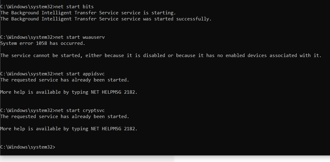 After you executing the command lines above, you start the Windows Update related system services.