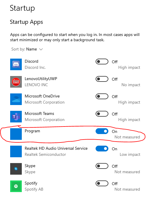 Open the Task Manager > go to the Startup tab > and look for a similar entry named "program" to ascertain details about it. Normally, you can disable it from there or you can manually delete the entry from the Windows registry. It can typically be found in one of these paths: