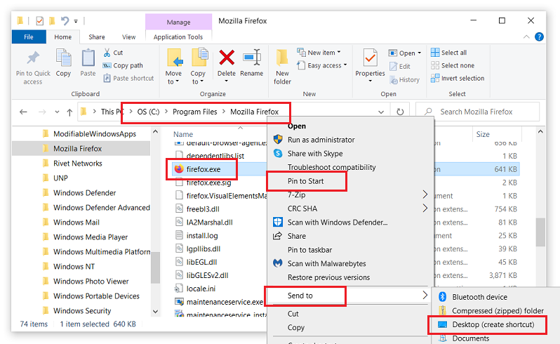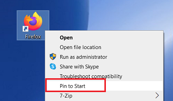 First, create a shortcut to the main executable (.exe file) on your Windows desktop. Browse to the .exe file in File Explorer, right-click and choose either Pin to Start to add a tile to your Win 10 Start menu or **Send To | Desktop (create shortcut)**if you also want to create a desktop shortcut. I've used the executable for my Firefox browser as an example.
