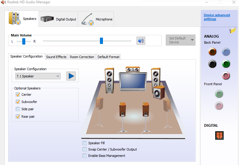 Realtek HD Audio Manager settings, working with 5.1 in Windows 7: