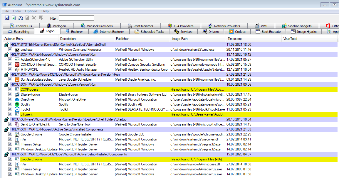 Please read through the entire Logon tab and collect the information from all unknown or suspicious items before reporting them in your Reply here rather than having multiple replies. One easy way to do this is to open a Notepad window, then right-click on a suspicious item in Autoruns, select Copy, and then Paste into the Notepad window. When you're done, just Select All (CTRL+A) in the Notepad window, Copy (CTRL+C), and Paste (CTRL+V) into your Reply.