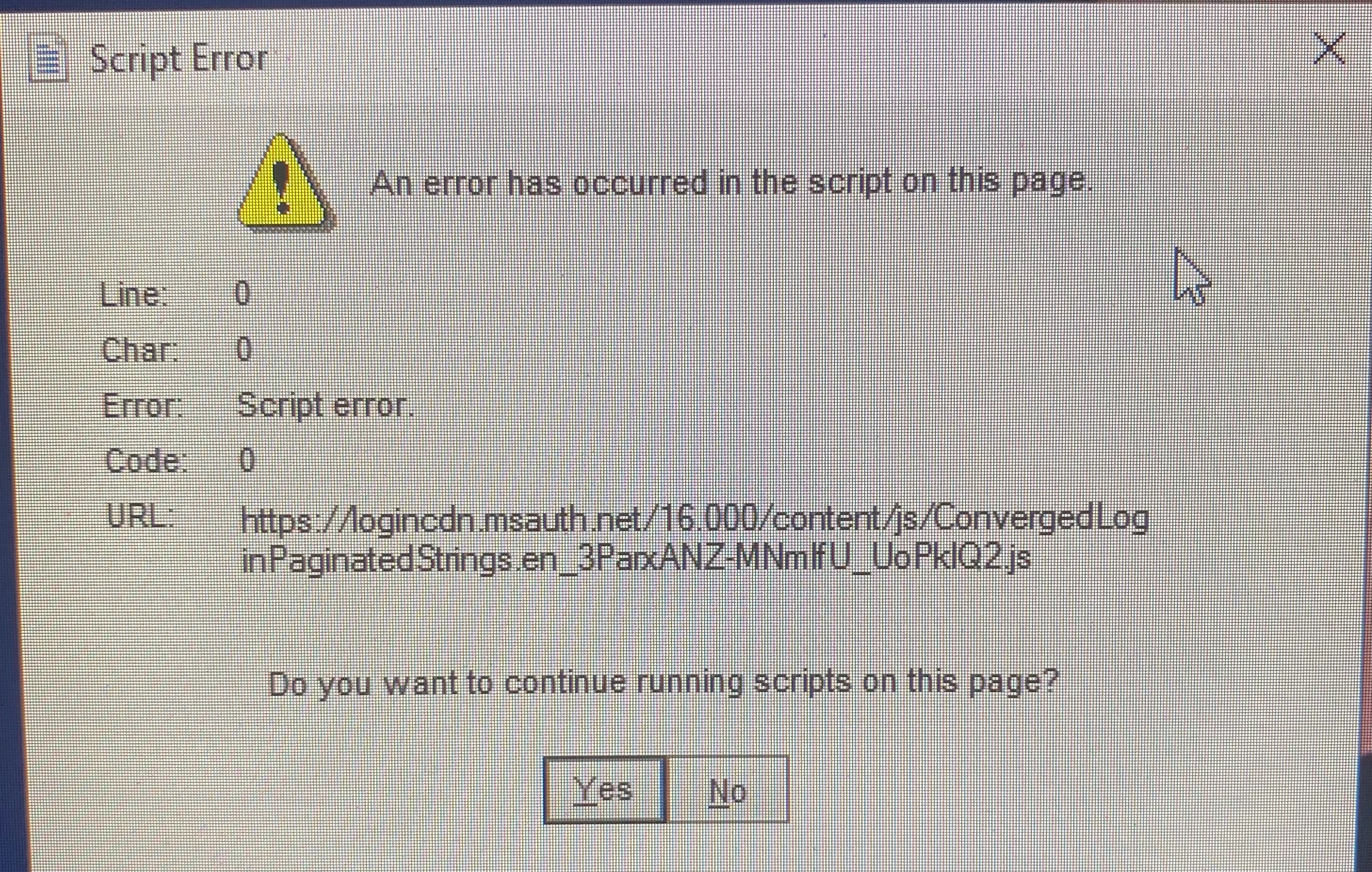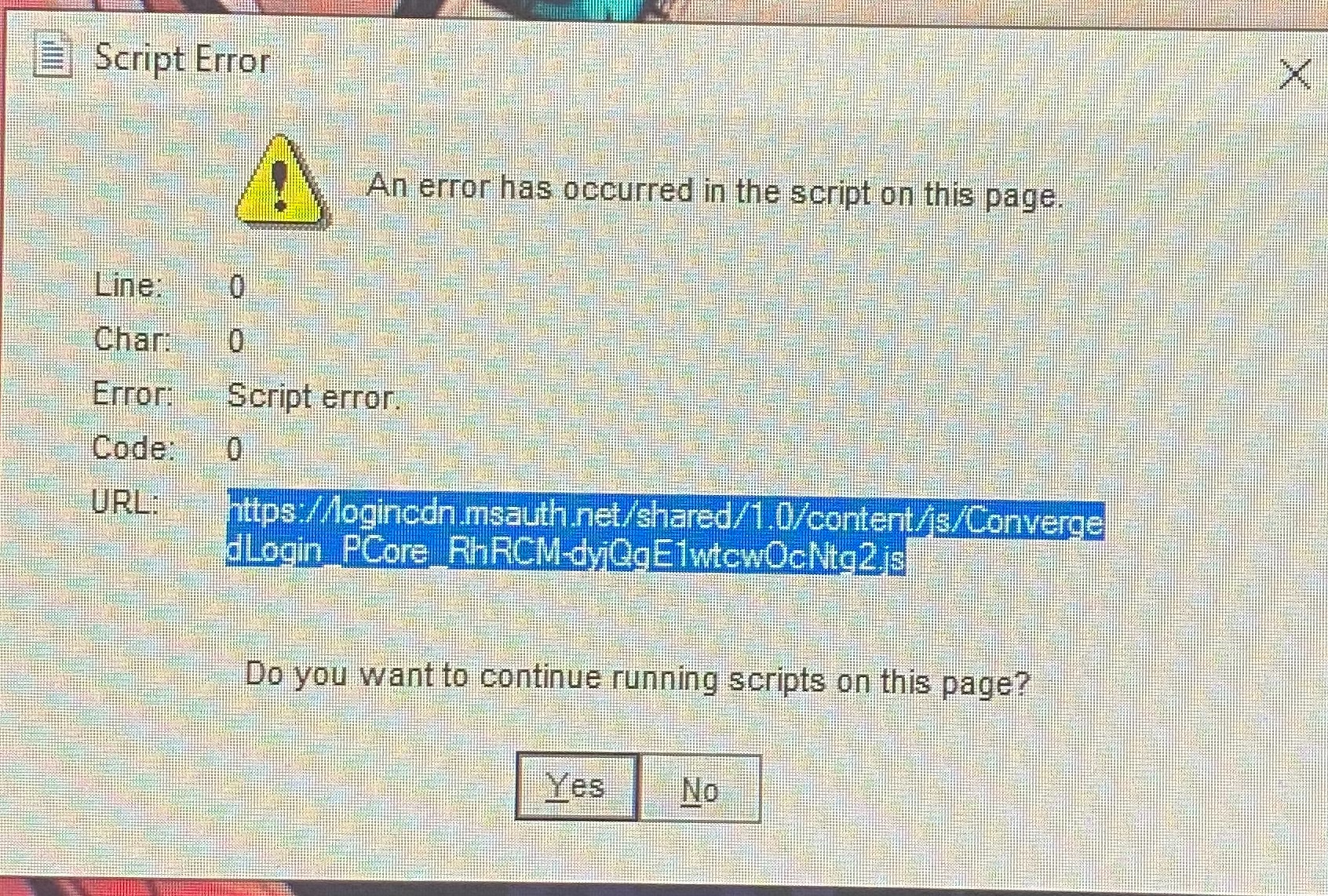 Looking at this post Windows 10 during log in displays script error https:\logincdn.msauth.net/16.000/js/ConvergedLoginPaginate (microsoft.com) the user found it was Dell software.