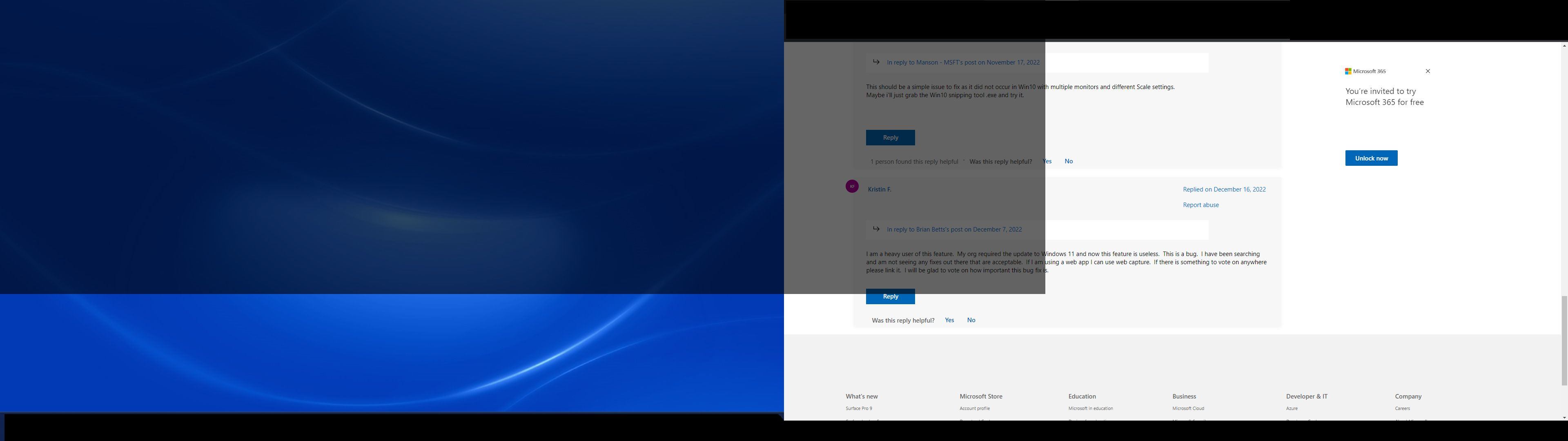 On Windows 11, if you have multiple monitors with different scale settings and resolutions, the snipping tool doesn't work properly. What happens is the smallest monitor's resolution determines what portion of the other monitors can be snipped. For example, I have three monitors on my Surface Laptop 4, the primary is 2496 x 1664 and is set to 150%. The second is 1920 x 1080 and at 100%. Third is 3440 x 1440 at 100%. When I hit print screen, it only greys out a portion of the first and third monitor. And the second isn't even greyed out at all. I've determined that if I put the all the monitors at the same scale, say 100%, the snipping tool works fine. It's only when one of them is different that the snipping tool doesn't work. Also, it doesn't matter if it's three monitors. This happens to me when I have only two monitors connected. I'm just using my current setup as an example.