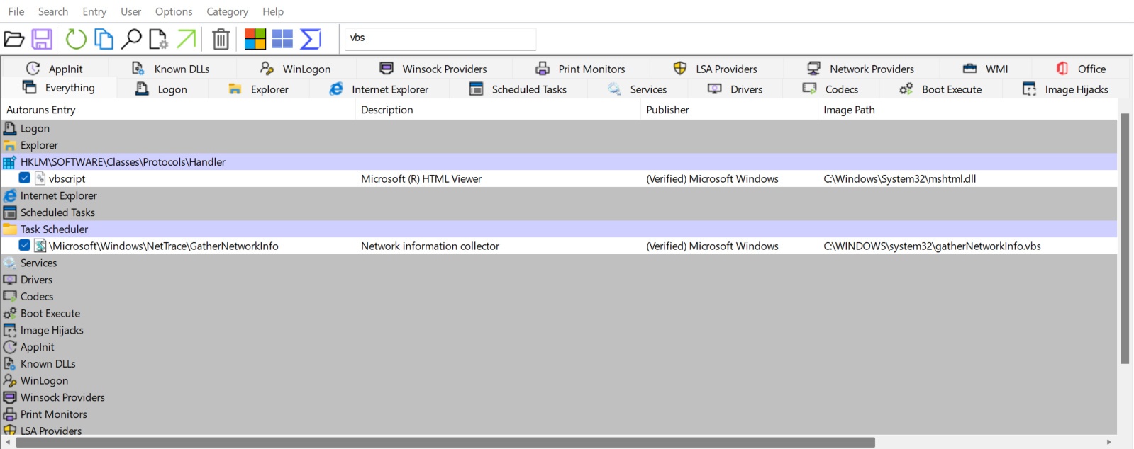 In the filter box in Autoruns, type vbs