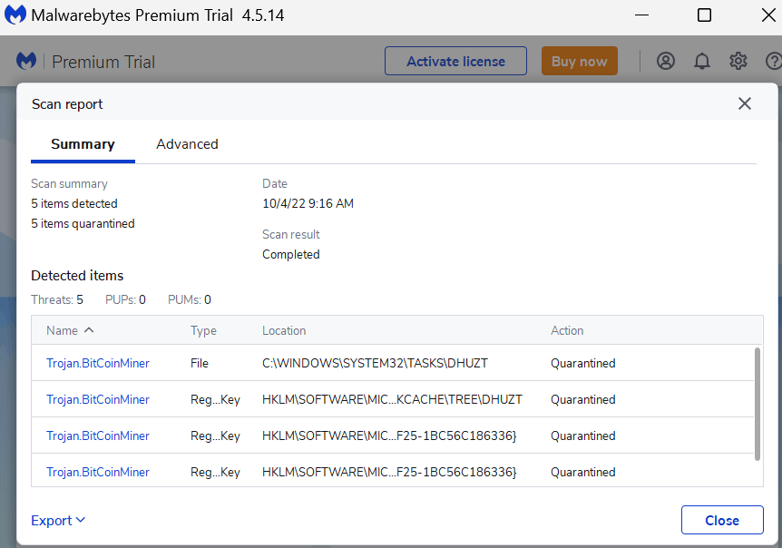 _AW_ 64,331 Reputation points Volunteer Moderator2022-10-04T01:37:40+00:00 As you've allowed Malwarebytes to quarantine the miner, just monitor your computer for any further signs of infection. The original source of the infection has not been removed by Malwarebytes, so that may or may not be still on your computer. It may have come onto your computer as a fake download; game hacks, mods, cracks and keygens are a common vector.