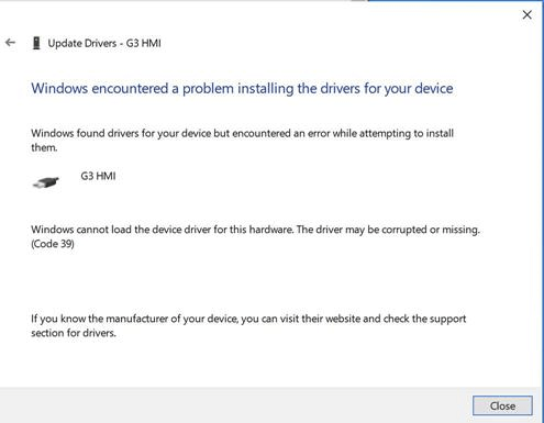 If Windows shows the following error ”Windows cannot load the device driver for this hardware. The driver may be corrupted or missing. (Code 39) {Bad Image} %hs is either not designed to run on Windows or it contains an error. Try installing the program again using the original installation media or contact your system administrator or the software vendor for support. Error status 0x “