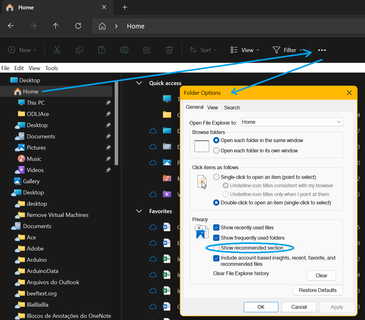 O Quick Access no Windows 11 pode ser encontrado dentro do Home no File Explorer, mas deve-se desativar o Show recommended section.