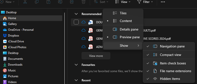 I'm sorry, I don't understand your answer. Your link is to the original question which does not show how to disable view all folders. I'm also puzzled as to why disabling view all folders should enable folders to be viewed in Home! This is my view menu in Explorer (if that's what it's still called :-))