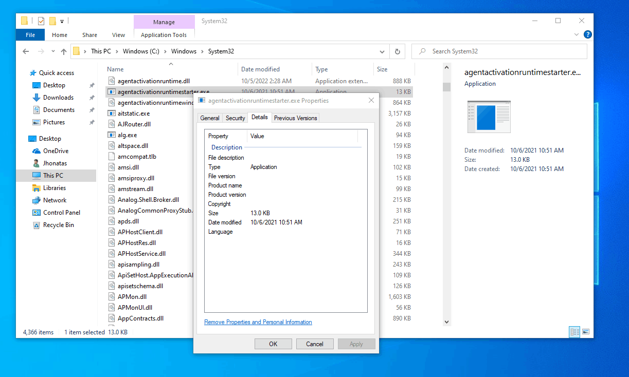 This File agentactivationruntimestarter.exe is located in C:\Windows\System32 and has no description in details tab when I right click it.