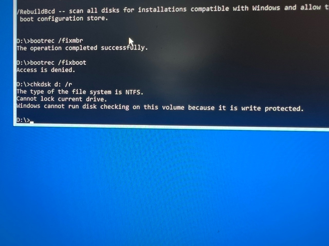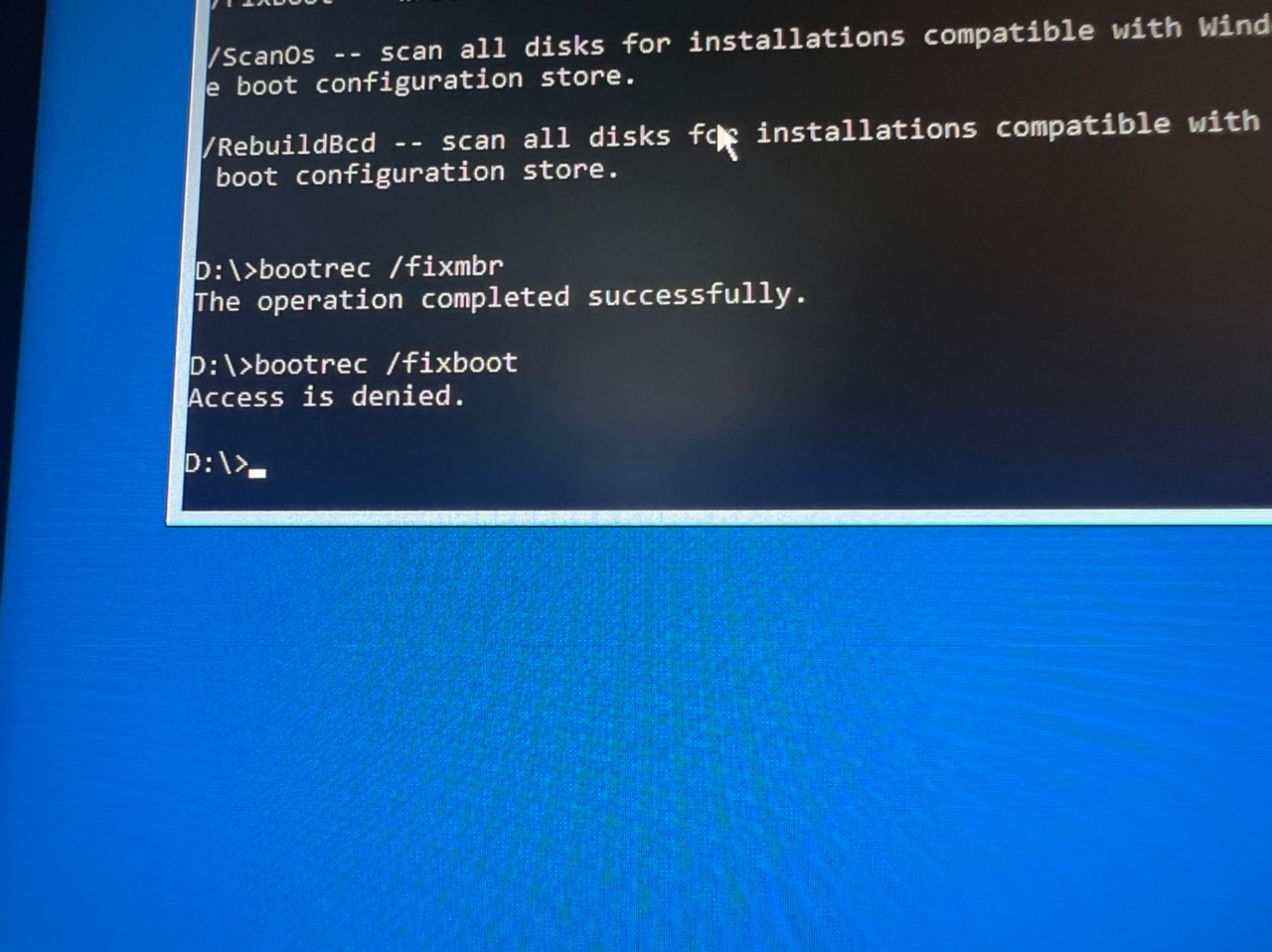 This is what happens when I try the bootrec method, it tells me my access is denied:
