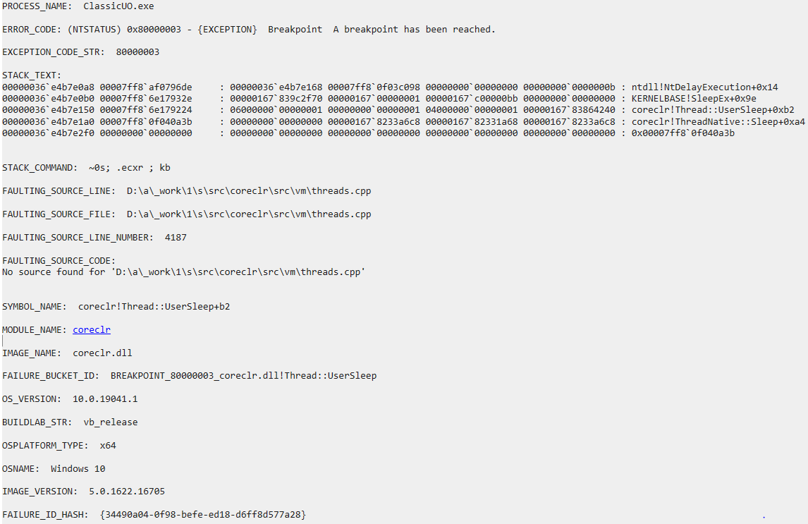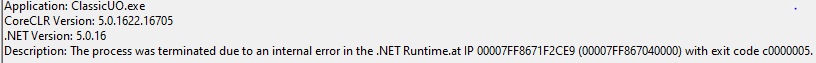 Closed all instances of classicuo.exe, attempted to delete the .net folder, required restart to delete, restarted, deleted. Started classicuo.exe, three classicuo.exe are open for a few hours without it unexpectedly closing. Opened the .net folder again, the coreclr.dll is there, what caused the classicuo.exe to close?