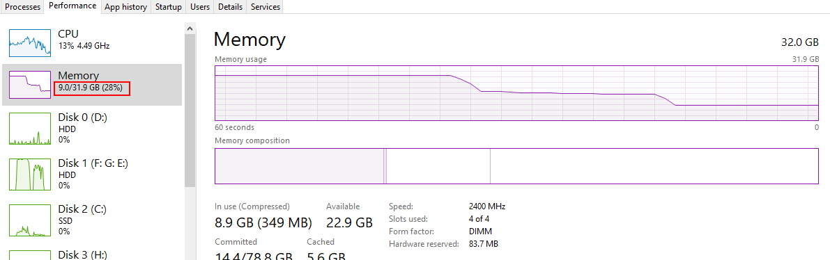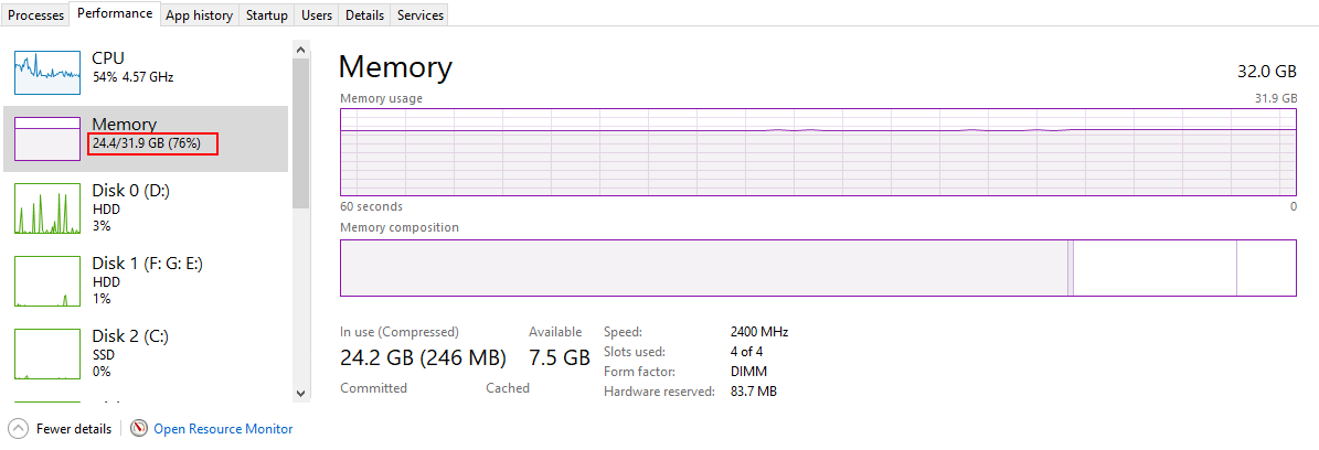 For example, here I see 24.4/31.9 GB total memory usage (whatever types of memory that may consist of is not strictly important to me).