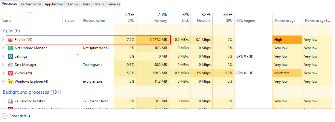 In the Processes tab, I see that Firefox supposedly uses about 5.7 GB