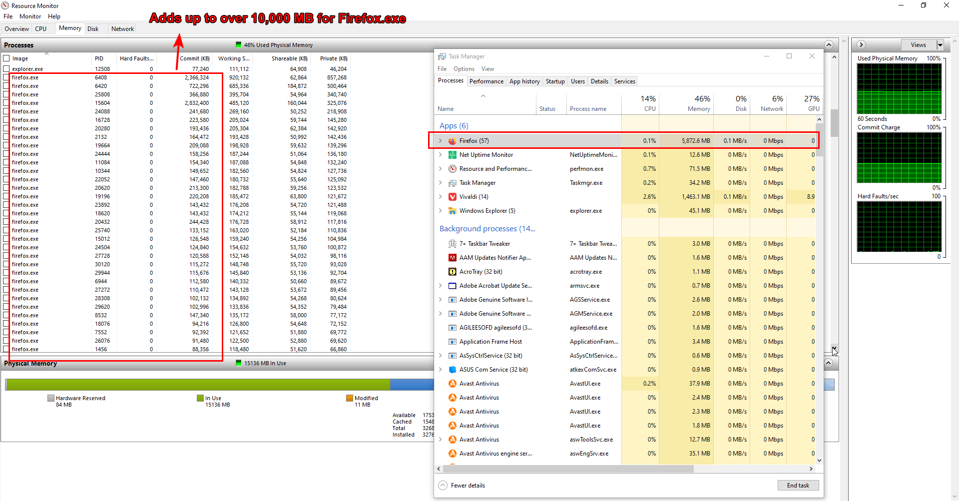So, closing FIrefox released an extra 9.7 GB on top of the 5.7 GB that was shown in the Process tab. This means that the Process tab reports memory very differently from the memory usage in the Performance tab. The process memory value is off by 9.7 GB in that example, which is insane. It sucks that the term 'memory' means completely different things in two different tabs in the task manager, and that's really annoying. I just need a way to know how much memory Firefox (or any other app) is REALLY using relative to the total memory usage in the Performance tab, because the Process memory value is off by a lot.