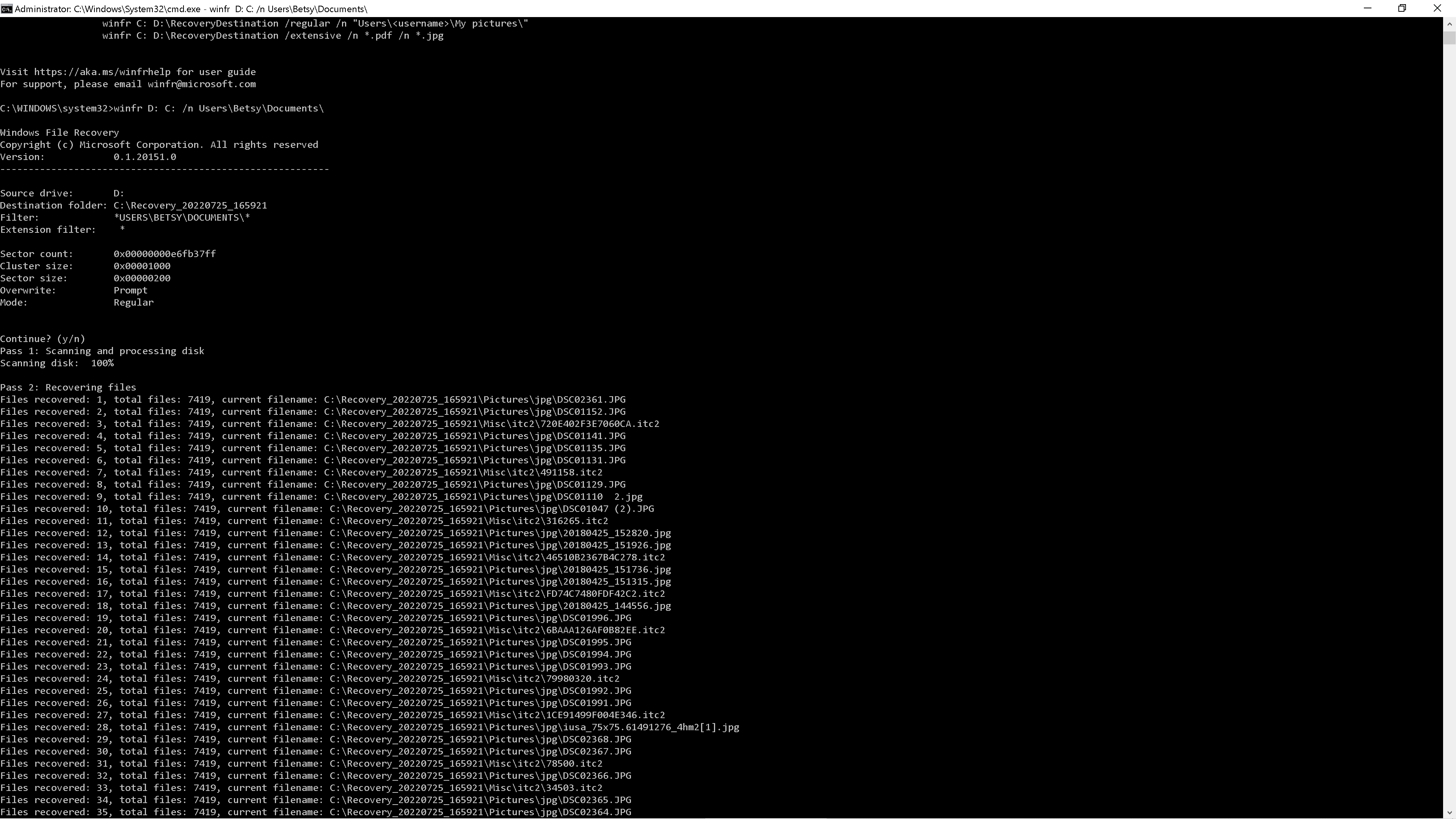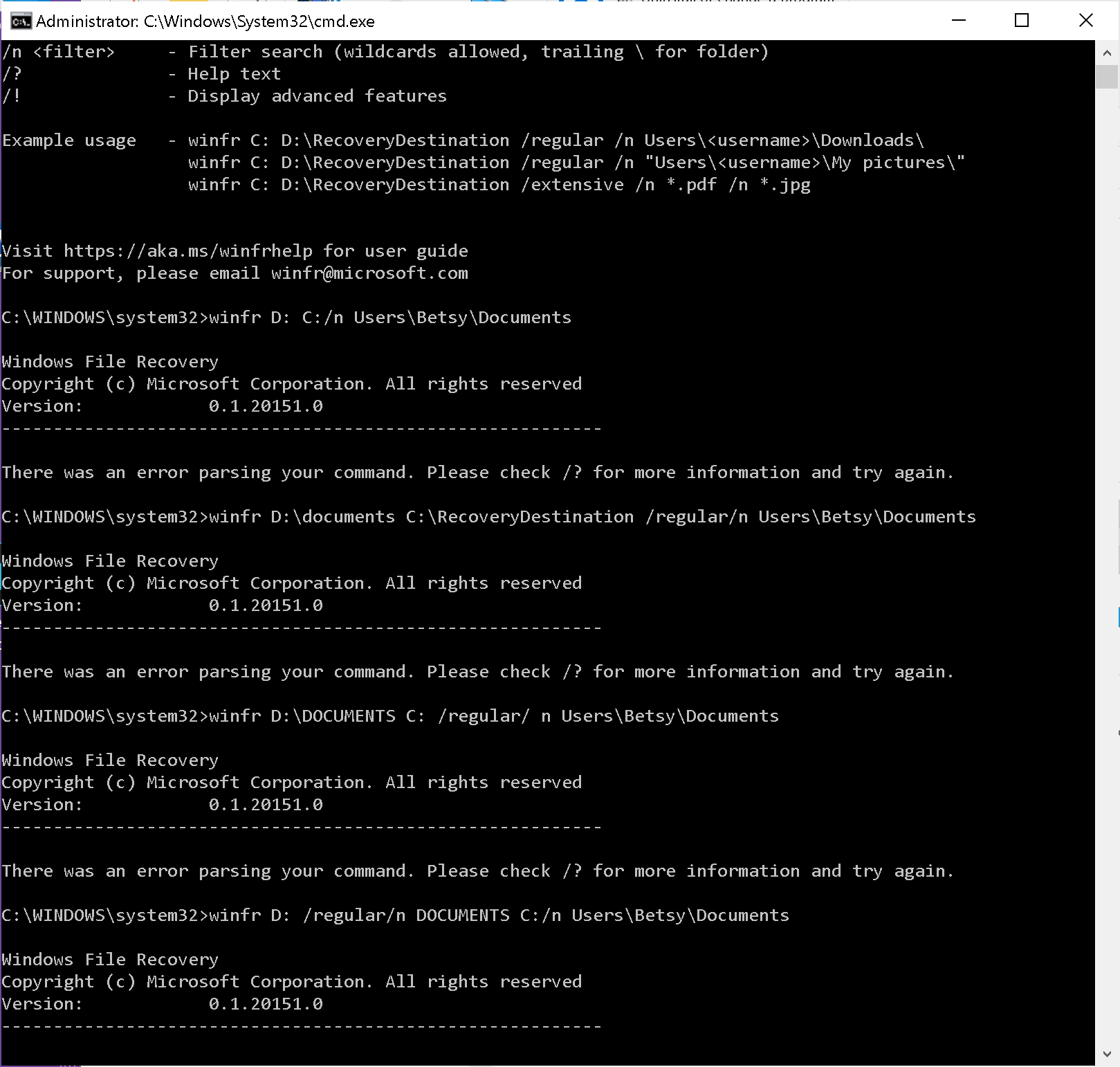 I accidentally deleted the contents of my D:\DOCUMENTS folder. I tried the Windows File Recovery app and keep getting the "There was an error parsing your command. Please check /? for more information and try again." error message. I am not entering something correctly. I should have added is that I have the documents that are intact up to April 1, 2022. I am looking for anything that was changed after that. I haven't used the computer since the deletion.