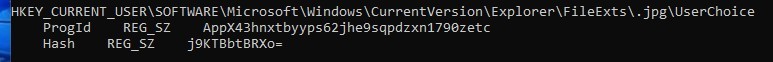 • reg query HKCU\SOFTWARE\Microsoft\Windows\CurrentVersion\Explorer\FileExts.jpg /s