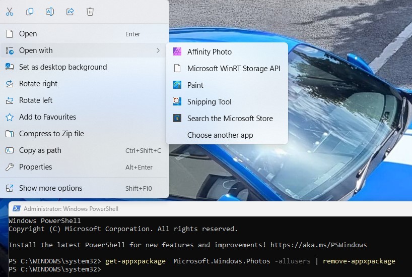 • get-appxpackage Microsoft.Windows.Photos -allusers | remove-appxpackage