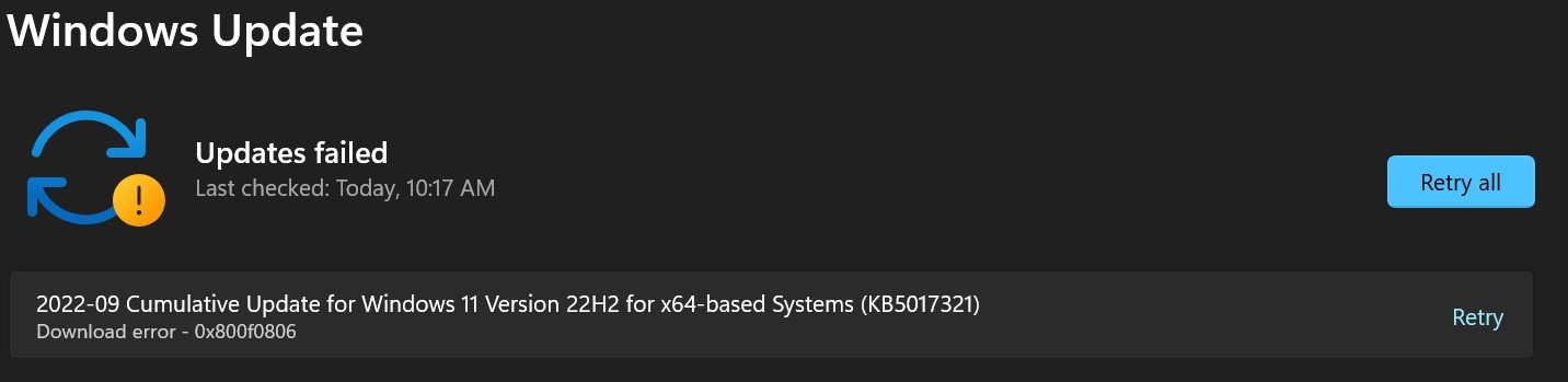 "KB5017321". The error is displayed as shown, with the error code "Download error - 0x800f0806". I have tried many times, but no success.