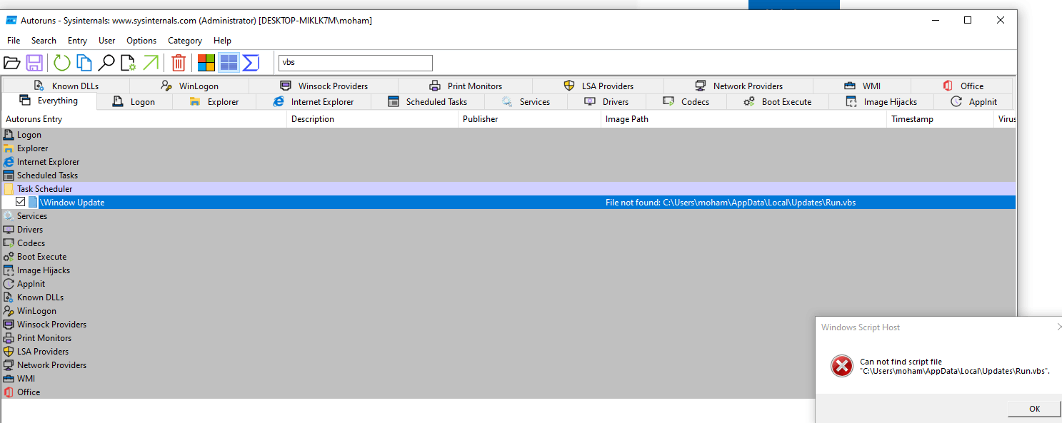 Windows Script Host error in AppData\Local\Updates\Run.vbs , Line: 31 , Char: 1 . The System cannot find the file specified .
