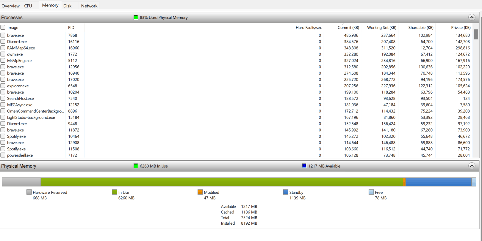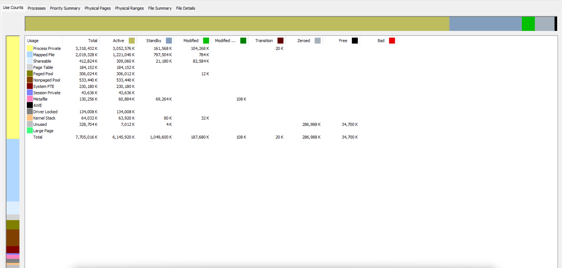 Type Resource Monitor in Search, run it as Administrator, select Memory tab to see how RAM is apportioned.