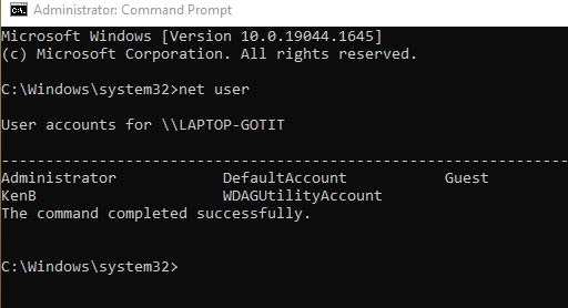 WDAGUtilityAccount displayed via net user with my username, and my Default Account as Administrator