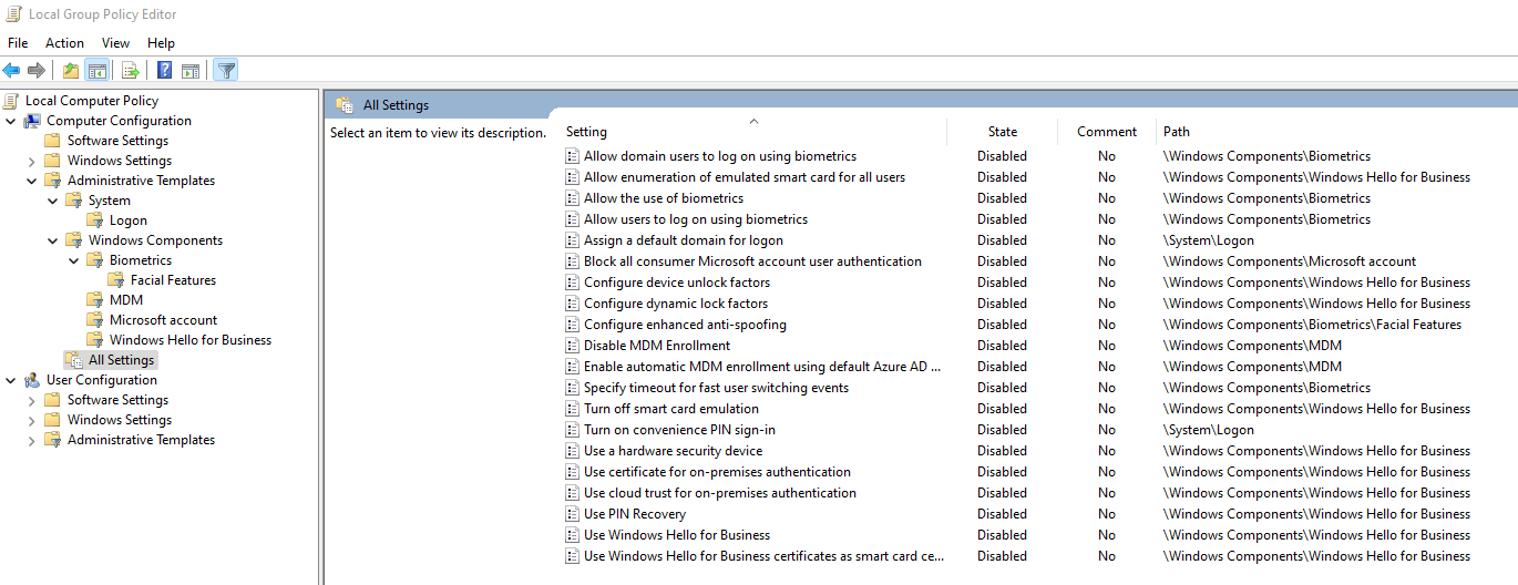 As I said I went with the spray and pray. I disabled anything I could find regarding Biometrics, Microsoft Accounts, MDM, and Windows Hello for Business. The screenshot below is everything I changed from Not Configured to Disabled.