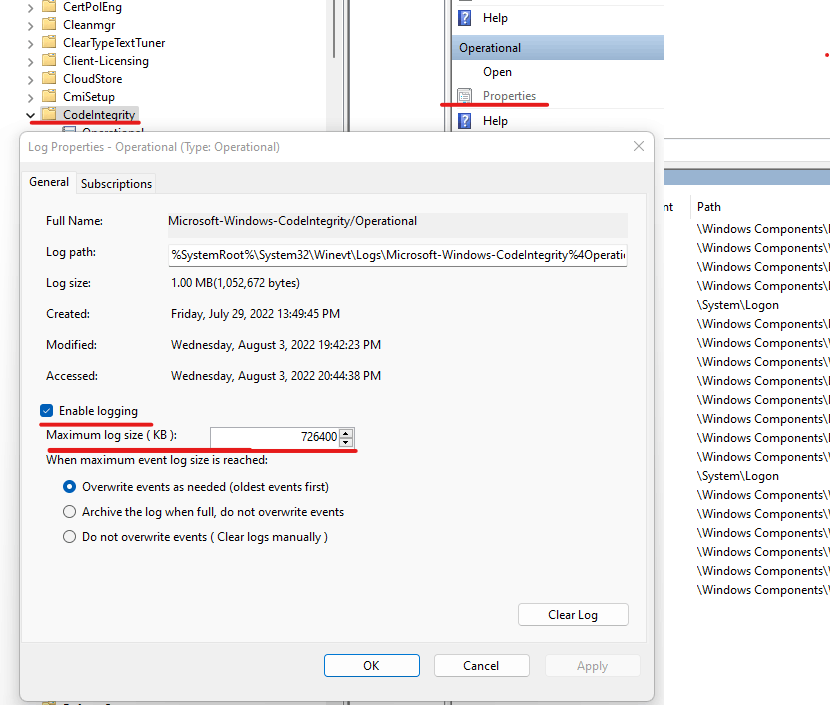 - The maximum file size for session "EventLog-Microsoft-Windows-CodeIntegrity-Verbose" has been reached. As a result, events might be lost (not logged) to file "C:\Windows\System32\Winevt\Logs\Microsoft-Windows-CodeIntegrity0x8800081Verbose.etl". The maximum files size is currently set to 1048576 bytes.