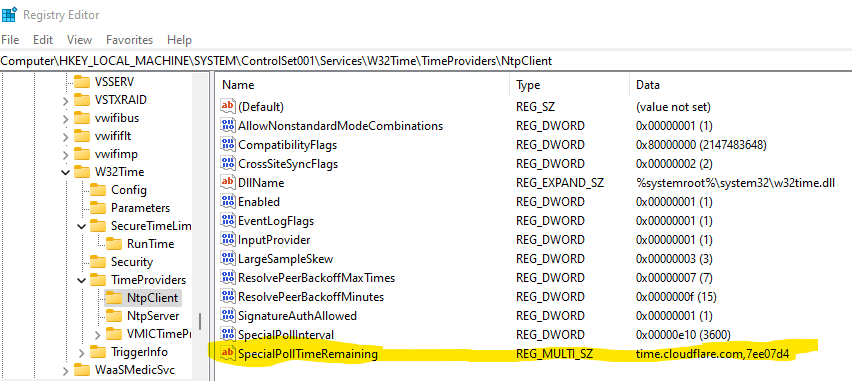 I changed my registry from time.microsoft.com to time.cloudflare.com. I did not change the hexadecimal numbers on the two entries. I only changed time.microsoft.com to time.cloudflare.com.