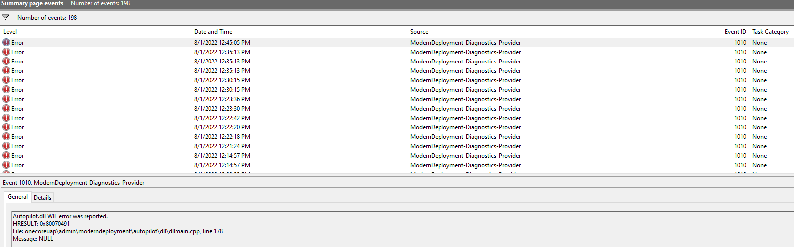 Many persistent errors in Event Viewer after Windows 11 build 22598.ni_release.220408-1503: "Autopilot.dll wil error was reported"
