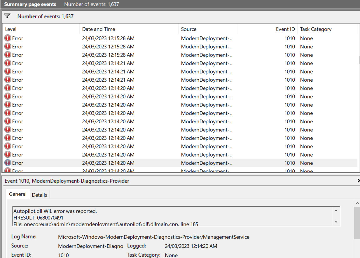 Many persistent errors in Event Viewer after Windows 11 build 22598.ni_release.220408-1503: "Autopilot.dll wil error was reported"