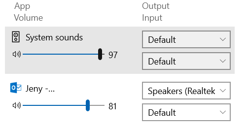 Click Start > Settings > System > Sound > Advanced sound options > Outlook > select the output device you want.